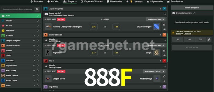 O 888F oferece uma grande seleção de opções de apostas em e-sports com probabilidades competitivas